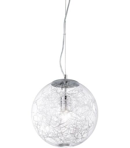 Collezione MAPA SFERE CON FILI DI ALLUMINIO Sopensione a 1 luce con montatura in cromo. Diffusore in vetro soffiato con decorazione interna in filo d'alluminio.. Cavo in acciaio a lunghezza regolabile da dispositivo ferma cavo automatico. Disponibile in due misure. ...