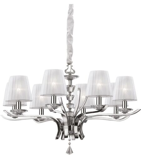 Collezione PEGASO CRISTALLO MOLATO Lampadario a 8 luci con montatura in metallo cromato. Corpo centrale, bobeches e pendagli in cristallo molato. Paralumi in organza. Copricatena in velluto.. Disponibile anche in ottone satinato. ...