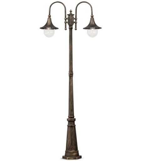 Collezione CIMA STILE COUNTRY CHIC Palo a 2 luci con corpo luce interamente in alluminio pressofuso. Con finitura nero e oro antico. Diffusore in acrilico trasparente.. ...