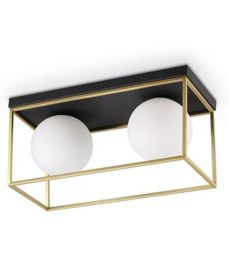 Collezione LINGOTTO LUCE INCORNICIATA Plafoniera a 2 luci con montatura in metallo verniciato: base nera opaca e telaio ottone opaco. Diffusori in vetro incamiciato bianco, soffiato e acidato.. ...