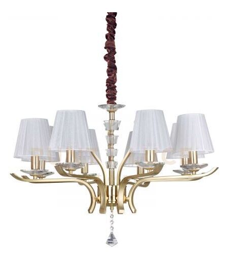 Lampadario A Sospensione Con Montatura In Metallo Ottone Satinato. Corpo Centrale, Bobeches E Pendagli In Cristallo Molato. Paralumi In Organza E Copricatena In Velluto. ...