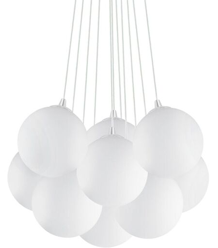 Collezione MAPA SFERE A GRAPPOLO Lampadario a sospensione a 11 luci con montatura in metallo. Diffusori a sfera in vetro bianco soffiato e acidato. Cavi in acciaio a lunghezza regolabile.. ...