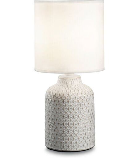Collezione KALI'-3 CERAMICHE INTARSIATE CHE RENDONO QUESTA LAMPADA UN PICCOLO CAPOLAVORO Lampada da tavolo con base quadrata in ceramica con decori in rilievo finitura bianca e avorio. Paralume in pvc rivestito con tessuto.. Attacco 1 E 14 max 40 W. Cavo in pvc con interruttore integrato. ...