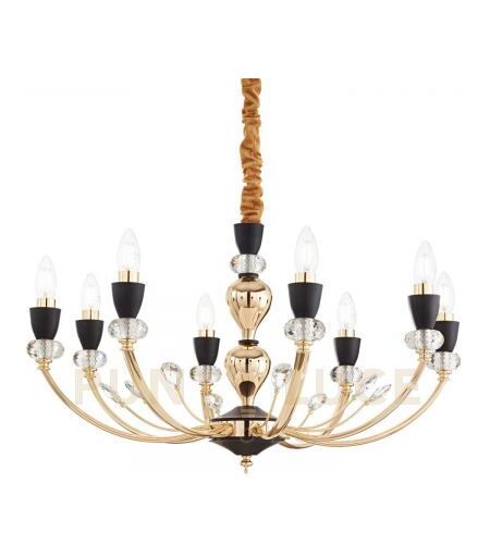 Lampadario A Sospensione Con Montatura In Metallo Dorato Con Dettagli Nero Opaco. Elementi Decorativi In Cristallo Molato. Copricatena In Velluto. ...