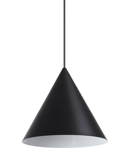 Collezione A-LINE CONI SOSPESI PER IL TUO LIVING Sospensione moderna a 1 luce con rosone in metallo verniciato a polveri.. Diffusore in metallo verniciato neroopaco con interno bianco. Cavo rivestito in tessuto. Monta lampadina con attacco grande E27 (non inclusa). ...