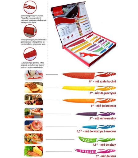 LAME COLTELLI IN ACCIAIO INOX PIU PELAPATATE LA CONFEZIONE COMPRENDE: COLTELLO DA CHEF COLORE ROSSO DA 20.5 cm COLTELLO PER IL PANE COLORE GIALLO DA 20.5 cm COLTELLO PER INTAGLIARE DI COLORE ARANCIONE DA 20.5 cmCOLTELLO MULTIUSO VIOLA DA 12.7 cmCOLTELLO PER FORMAGGIO DI COLORE ROSA DA 12.7 cmCOLTELLO DA PIZZA DI COLORE VERDE DA 10 cmCOLTELLO DA VERDURA DI COLORE BLU DA 9 cmPELAPATATE DI COLORE ROSSO ...