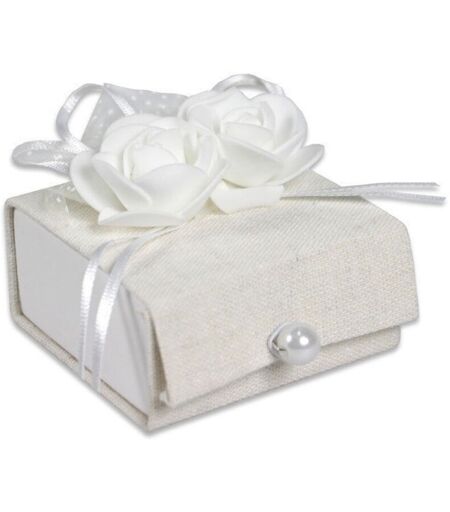 Raffinate e innovative scatoline portaconfetti in polietilene rivestito in tessuto avorio dove inserire confetti o caramelle. Perfetti per un matrimonio classico ed elegante. Presenta 2 fiori bianchi e tulle ed una perla dove verrà agganciato l'elastico per la chiusura.SPECIFICHE TECNICHE:Dimensioni: 7 x 7,5x3,5 cmMateriale: cartone e tessuto ...
