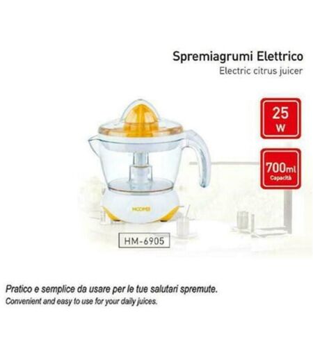 SPREMIAGRUMI ELETTRICO 25 WATT 700 ML AUTOMATICA A PRESSIONE HOOMEI HM-6905Benvenuto nel mondo della freschezza e della praticità con lo Spremiagrumi Elettrico Hoomei HM-6905. Se stai cercando un modo veloce e efficiente per goderti succhi di agrumi freschi ogni giorno, sei nel posto giusto. Con la sua potenza di 25 watt e una capacità generosa di 700 ml, questo spremitore elettrico ti offre la soluzione perfetta per preparare succhi ricchi di vitamine in pochi istanti.Caratteristiche principali:Potenza: 25WCapacità: 0.7LSpremitura automatica a pressione: Grazie alla sua funzione automatica a pressione, otterrai il massimo succo da ogni agrume con il minimo sforzo. Basta posizionare l'agrume sul cono e lasciare che lo spremitore faccia il resto per te.Doppio senso di rotazione del cono: Questo spremitore è progettato per garantire una spremitura completa e efficace. La sua funzione di rotazione bidirezionale, sia in senso orario che antiorario, assicura di estrarre ogni goccia di ...