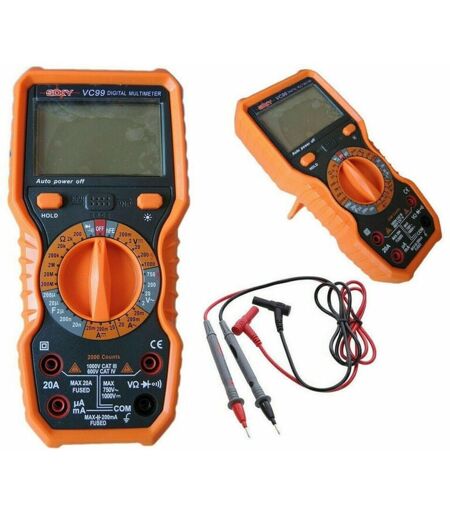 TESTER MULTIMETRO DIGITALE PUNTALI RILEVATORE AMPERE FARAD OHM VC99Tester multimetero digitale multifunzione ideale per quanto riguarda il campo dell'elettrica; prodotto indicato per elettricisti o per amanti del fai da te o per professionisti di altri settori come informatica ed elettronica, ma anche meccanica ed elettrauti. Misura IL VOLTAGGIO DC e AC, corrente AC e DC, resistenza, diodi, transistor, frequenze, temperature, capacità e continuità. Dotato di un display LCD retroilluminato. Dotato di sistema di spegnimento automatico. Guscio anti urto in gomma con supporto da tavolo e potente calamita integrata.Caratteristiche: Interruttore on/off Funzione di autospegnimento Alimentazione: Batteria 9V inclusa 2 puntali inclusi Schermo LCD rtetroilluminatoDC Tensione: Passi: 200mV, 2V, 20V, 200V, 1000V Risoluzione: 0.1 mV, 1 mV, 10 mV, 100 mV, 1 V Precisione: 0,5% + 0,8% + 1cifra a 2 cifreTensione AC: Passi: 2V, 20V, 200V, 750V Risoluzione: , 1 mV, 10 mV, 100 mV, 1 V Precisione: 0,8% + ...