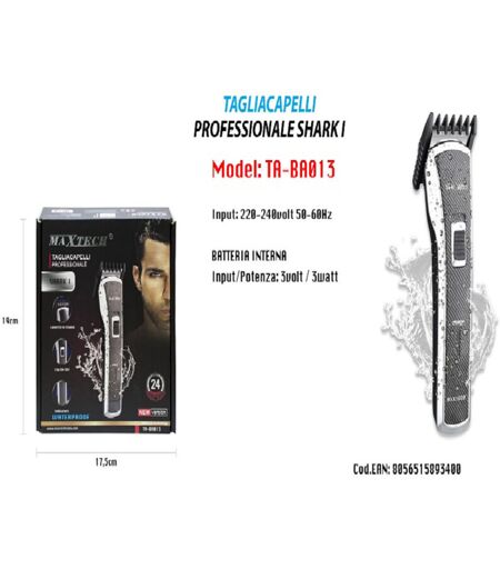 MACCHINETTA TAGLIA CAPELLI BARBA MAXTECH PROFESSIONALE SHARK 1 WATERPROOF. LA MACCHINETTA CONTIENE SOLO UN RICAMBIO DI MISURATORE TAGLIO REGOLABILE STESSO VICINO ALLA MACCHINETTA SU 4 PIANI.NUOVA VERSIONE TA-BA013LAMETTE IN TITANIOCLIP ON OFFINDICATORE RICARICACOMPLETA DI ALIMENTATORE E BASE PER CARICARESENZA FILIINCLUSA DI PETTINE PER PULIRE I PELI RASATI E OLIO ...