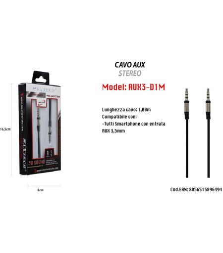 CAVO AUX STEREOCaratteristiche tecniche: Colore: Nero, Rosso e Bianco Compatibile con smartphone entrata aux 3,5mm Lunghezza cavo: 1 metro Consente di ascoltare musica attraverso l'ingresso aux. Ottimo per collegare il vostro smartphone o dispositivo musicale e qualsiasi dispositivo con entrata 3,5mmN.B.IL COLORE DELL'OGGETTO SARA' SPEDITO IN BASE ALLA DISPONIBILITA' E PREVIA COMUNICAZIONE DA PARTE DELL'ACQUIRENTE. ...