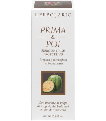 Prima & Poi Siero Antiage Protettivo Indicazioni: previene il precoce invecchiamento cutaneo. Modalità d'uso: versare sulla punta delle dita, utilizzando il contagocce, una modesta quantità di prodotto, applicandola poi con lieve massaggio circolare su viso e decolleté. Seguire con l'applicazione di un solare. Ripetere dopo il bagno in mare o la doccia e soprattutto a fine giornata di sole. Caratteristiche: contiene: - Olio di Amaranto e l'Estratto di Polpa di Anguria del Kalahari, dall'attività antiossidante; - Estratto di Opuntia e Crusca si Riso, dalle proprietà idratanti ed elasticizzanti. ...