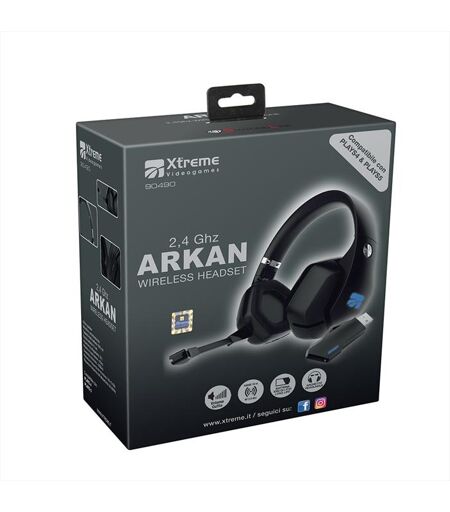 HEADSET WIRELESS ARKAN 2,4 Ghz per Plays 5/Plays 4 - Caratteristiche tecniche: Frequenza: 20 – 20.000 Hz Altoparlante: 40 mm Connessione: Wifi 2,4 Ghz Microfono: Orientabile e staccabile Batteria: Ioni di litio 1000 mA LED: Si Campo di funzionamento: 10 mt Charging time: Circa 4 ore Working time: Circa 13 ore Impendenza auricolare: 20 O Tensione di lavoro: 83mA Cuffie over-ear: Esperienza sonora coinvolgente Materiali: Resistenti e traspiranti - La cuffia Arkan è stata progettata per una perfetta esperienza di gioco. Raggiungi i vertici in tema di suono, luci e comfort per affrontare le giuste sfide - Isolamento acustico: grazie agli altoparlanti con ottimo isolamento acustico potrai immergerti totalmente nel gioco, senza distrazioni. - Archetto e microfono regolabile: l’archetto regolabile garantisce la dotazione perfetta per sessioni di gioco prolungate. È possibile parlare con i compagni di squadra con il microfono orientabile e staccabile. - Altoparlante da 40mm e grandi padiglioni: producono un suono completo ed espansivo per un’esperienza di gioco più coinvolgente. Potrai ascoltare l’audio dei tuoi giochi nel modo in cui merita essere ascoltato: impressionante. Inoltre, grazie ai grandi e morbidi padiglioni, realizzati con materiale traspirante, giocherai in totale comfort. - Movimenti liberi: consente di utilizzare le cuffie a una distanza compresa tra 6 e 10 metri dal trasmettitore USB, offrendo la libertà di muoversi senza cavo durante le tue sfide con gli amici. ...