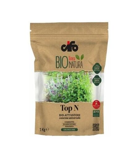 CONCIME UNIVERSALE GRANULARE BIO-ATTIVATORE TOP N BioNatura Top N, concime universale pronto all’uso, consentito in agricoltura biologica, completamente naturale per tutte le piante ornamentali, gli ortaggi e le aromatiche. Formulazione esclusiva in microgranuli a cessione graduale, ricca in azoto organico e sostanze biologicamente attive, che garantisce una nutrizione costante ed equilibrata per 3 – 4 mesi. Svolge un’azione energetica sostenendo le piante durante le fasi più delicate (semina/trapianto, ripresa vegetativa, fioritura/fruttificazione), le rende più sane, rigogliose, folte, con foglie dal colore verde intenso e promuove fioriture e raccolti abbondanti. La presenza nella matrice organica della molecola APR® (Attivatore Proteico della Rizosfera) lo rende un fertilizzante particolarmente innovativo e caratterizzato da un’elevata efficienza nutritiva. BioNatura Top N è consigliato l’utilizzo da marzo a ottobre. Dosare la quantità desiderata nell’apposito misurino e ...