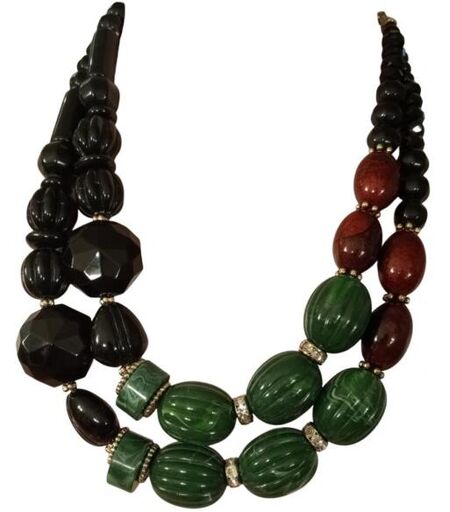 Rendi esclusivo il tuo look indossando questa collana raffinata e di grande effetto. Design a due fili di luminose pietre che si alternano a boule, sferette a spicchi e rondelle di metallo. Un accessorio in una versione dai toni del verdone, nero e bordeaux, perfetto per qualsiasi occasione. Targhetta Sodini sulla chiusura. Materiali: resine. Lunghezza 50 cm. Chiusura a con moschettone. ...