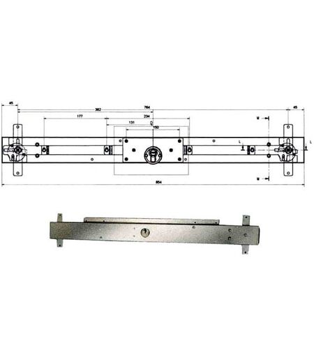 Serratura a spranga per porte basculanti e cantina 4 punti di chiusura: 2 inferiori - 2 superiori Fori protettore mm 38 Sbloccaggio interno/esterno con chiave Maniglia esterna e interna non inclusa Scatola mm 854x71x27 Cilindro non incluso ...