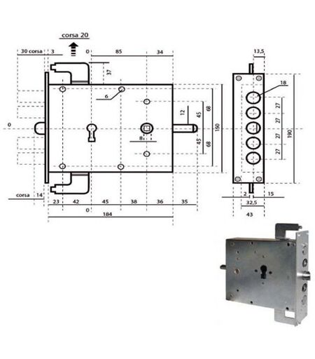 Serratura profilo europeo a planare Fori protettore mm 38 2 chiusure verticali Catenacci laterali 4pistoni e scrocco Interasse mm 27 Scatola 150x184- ENtrata 65 Cilindro non incluso ...