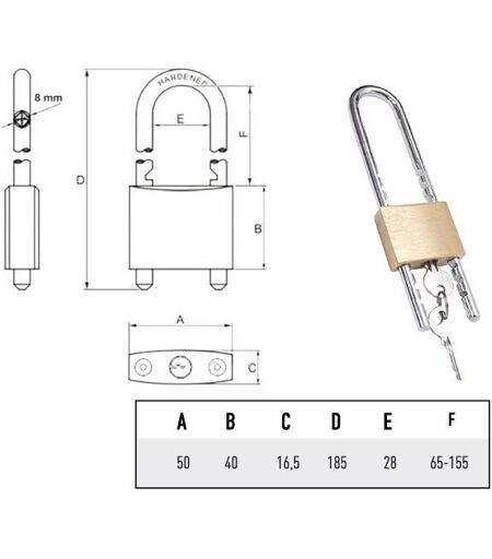 Corpo monoblocco ottone smerigliato Arco lungo acciaio carbonitrurato nichelato Altezza arco regolabile mm 65/155 Doppio sistema di bloccaggio arco 2chiavi ...