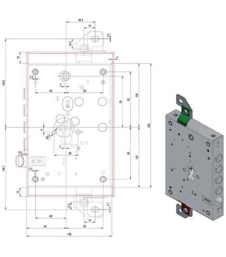 Serratura profilo europeo a planare Fori protettore mm 38 2 chiusure verticali Catenacci laterali 4pistoni e scrocco Interasse catenacci mm 28 Scatola 136x206 - Entrata 73 Cilindro non incluso ...