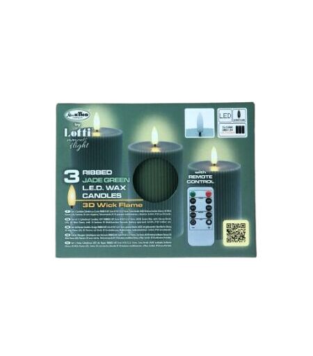 Set 3 candela 3df a coste ribbed D7.5 H10/12.5/15 verde bianco caldo Lotti importex1 confezione formata da un set di 3 candeleDimensione: D7.5cm-H10cm-12.5cm-15cmColore verdeLuce bianco caldo Caratteristiche tecniche Accessori in Dotazione ...