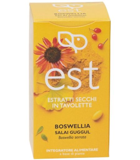 est BOSWELLIA - Descrizione Integratore alimentare con boswellia. Agisce favorevolmente sulla funzionalità articolare. Adatto ai vegani. Ingredienti Boswellia (Boswellia serrata Roxb. ex Colebr., maltodestrina) gommo - resina estratto secco titolato al 65% in acidi boswellici totali 50%; stabilizza… ...