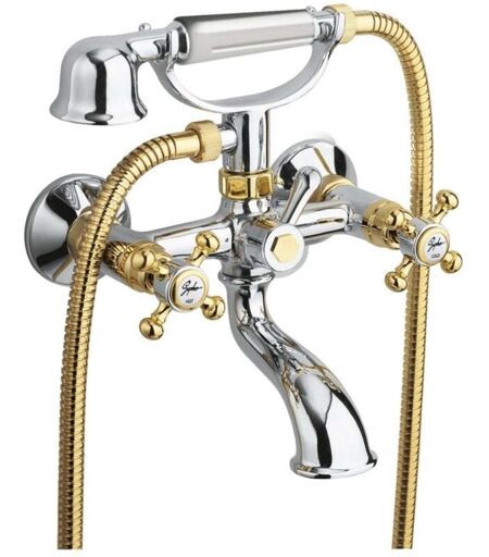 Rubinetto per vasca da bagno a muro finitura cromo/oro materiale ottone installazione a parete tipo di deviatore girevole forma retrò passo delle alimentazioni dell’acqua 150 mm la confezione contiene una doccetta a mano, un tubo flessibile e un supporto per la doccetta a mano lunghezza del flessibile della doccia 1700 mm ...