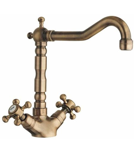 Miscelatore verticale per lavello con braccio retrò colore bronzo materiale ottone installazione a terra tipo di comando rubinetto collegamento alla rete idrica 3/8'' dimensioni 195 × 175 × 240 mm braccio di erogazione girevole la confezione contiene tubi flessibili di collegamento, lunghezza 330 mm ...