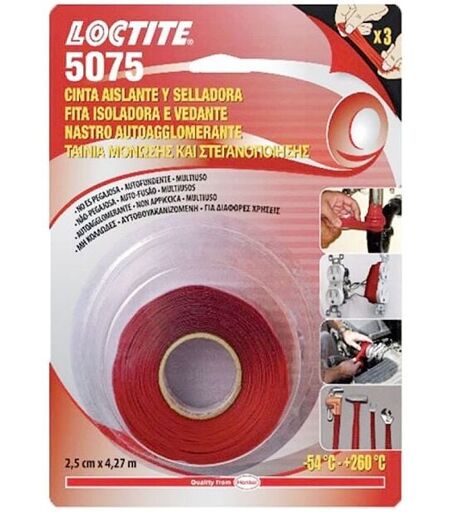 LOCTITE 5075 è un innovativo nastro senza adesivo che una volta avvolto intorno ad una superficie fonde su se stesso, sigilla e protegge istantaneamente l'area da perdite d'aria e d'acqua, corrosione e urti. Sviluppa la sua massima resistenza dopo 24 ore. Trova innumerevoli applicazioni nel settore industriale (isolamento elettrico, sigillature d'emergenza di perdite d'aria, acqua, olio, carburanti, acidi), in quello automobilistico e marino (resiste all'acqua salata, applicazione anche sott'acqua, etc). Sopporta condizioni estreme: temperature da -54°C a +260°C, raggi UV... LOCTITE SI 5075 è un nastro di gomma siliconica raccomandato per ottenere un affidabile ma temporanea riparazione su di un ampia varietà di materiali. LOCTITE SI 5075 non avendo proprietà adesive deve essere utilizzato come un nastro che in maniera autonoma si aggrappa alle superfici . Le applicazioni tipiche sono sigillature e riparazioni di tubi flessibili,raccordi, utensili ed anche come nastro isolante ...