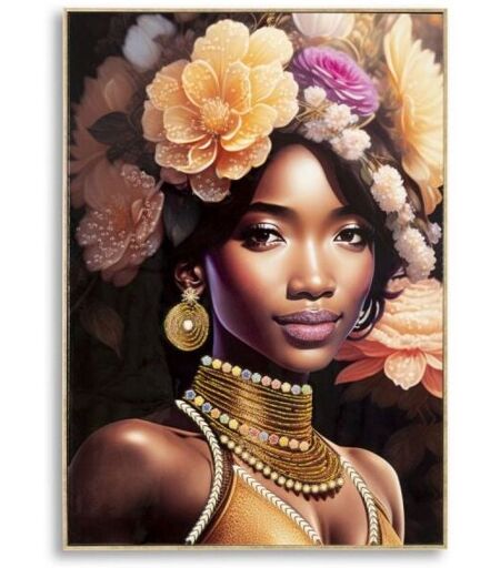 Dipinto su tela con intelaiatura in legno raffigurante una donna in abiti tradizionali e con fiori sulla testa. Completo di cornice in metallo dorato. ...