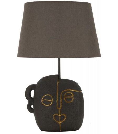 Lampada da tavolo in resina dalla forma ispirata ad un volto tribale impreziosita da tratti dorati. Completa di paralume in tessuto grigio. ...