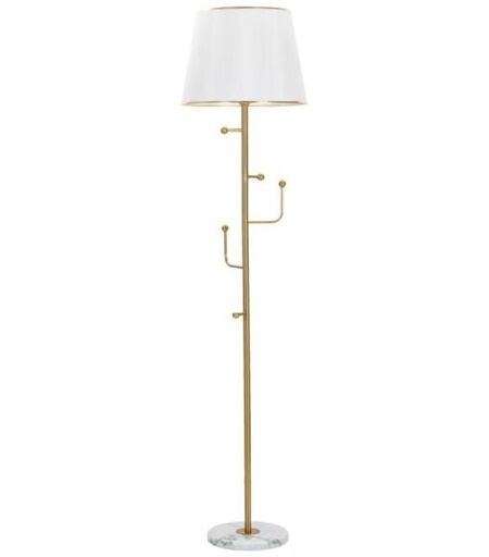 Piantana in metallo dorato con base in marmo dal design semplice ed essenziale dotata di 5 ganci appendiabiti. Completa di paralume in tessuto bianco con eleganti bordi dorati. ...