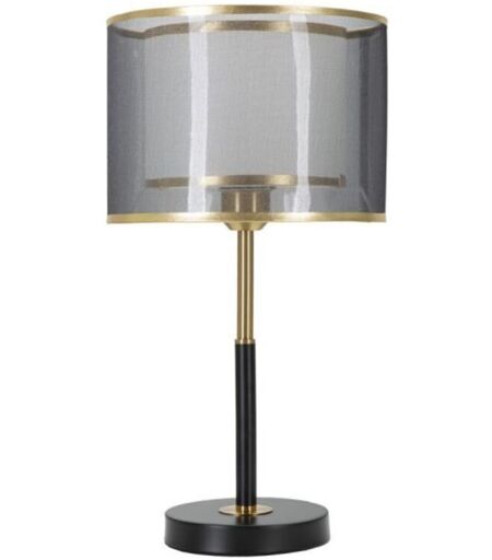 Essenziale lampada da tavolo in metallo nero e oro con paralume in tessuto a due livelli, il livello interno è bianco mentre quello esterno è grigio trasparente, entrambi con un elegante bordo dorato. ...