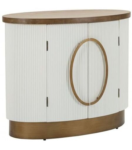 Mobile ovale in legno bianco con piano e inserti in legno marrone dal design arrotondato. Finemente decorato con linee in rilievo. Completo di 2 ante. ...