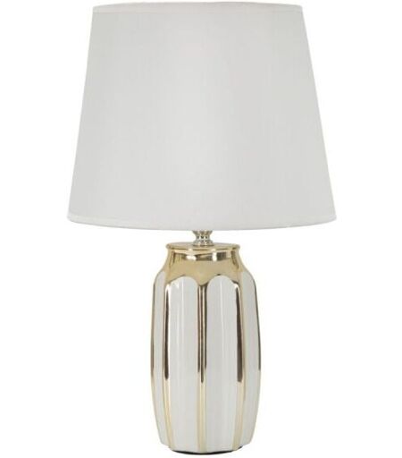 Lampada da tavolo in ceramica bianca e dorata dal design geometrico e dalle linee arrotondate. Completa di paralume in tessuto bianco. ...