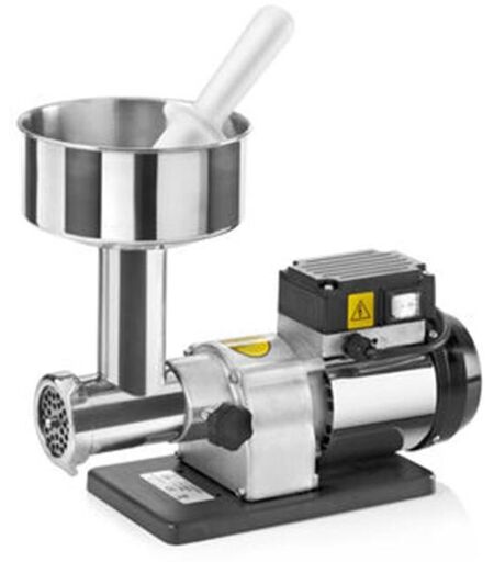 Corpo, elica, tramoggia e carter motore in acciaio inox Piastra e coltello autofilettante in acciaio inox Basamento in acciaio inox Motore a induzione asincrono monofase da 220 V / 50 Hz (motori per differenti tensioni e frequenze e diversa potenza a richiesta) e certificato per uso continuo Veloce e comodo smontaggio per una facile e rapida pulizia Corpo spremipomodoro opzionale Caratteristiche tecniche Potenza: 300 W Giri dell'elica: 160 r.p.m Produzione oraria: 80 Kg/h (carne di durezza media, con piastra di primo montaggio) Peso: 8,5 Kg Ingombro: 39,5x34,6x16,5 cm Base in materiale alveolare antiscivolo ...