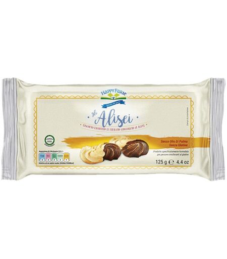 Happy Farm - ALISEI - Descrizione Fragranti biscotti ricoperti di cioccolato al latte. - Ingredienti Cioccolato al latte (28,5%): zucchero, burro di cacao, latte in polvere, pasta di cacao; emulsionante: lecitina di soia; aroma naturale di vaniglia; farina di riso, uova, amido di mais, burro, zucch… ...