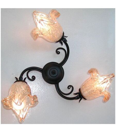 LAMPADA PLAFONIERA APPLIQUE LANTERNA EMOZIONI 3 LUCI DIAMETRO CM40 NERO/RUGGINE Elegante applique a 3 luci in ferro battuto forgiato a mano, color ruggine, rifinito da delicati riccioli di ferro in stile Liberty e paralume in vetro soffiato color ambra di forma floreale. L'applique ''Emozioni'' regala bellezza e quel tocco di classe, tipico dello stile Art Nouveau. Abbinabile agli altri complementi della collezione. Dimensioni: à 40â x 15 â cm (sporgenza max cm. 15) Consiglio d'uso: L'applique ''Emozioni'' è stata pensata per illuminare e arredare qualsiasi stanza della vostra casa, o della vostra attività . 3 lampade E14 max 40 W- IP40 uso interno - 220-240 V / 50Hz - lampadine escluse - garanzia 5 anni ...