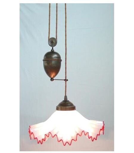 LAMPADARIO SALISCENDI MURANO 1 LUCE IN FERRO BATTUTO CRUCCOLINI Il fascino dal sapore rétro della struttura in ottone si unisce ad un elegante fazzoletto plissettato in vetro di Murano. Il sistema saliscendi permette di regolare l'altezza del lampadario; più in alto per illuminare tutta la stanza, oppure in basso per creare un'atmosfera più intima. Un affascinante meccanismo di carrucole e pesi di bilanciamento, fa scorrere il cavo elettrico Old-Style dal tipico design a funicella, permettendone la regolazione. Il pregiatissimo paralume è realizzato a mano in vetro latte, mentre il bordo colorato è stato ottenuto applicando intorno alla struttura principale un filo in vetro colorato. Al tatto si può apprezzare l'esclusiva lavorazione di questo prezioso paralume unico nel suo genere. Da abbinare agli altri complementi della collezione. Dimensioni: à 35â x 60/180 â cm Consiglio d'uso: Ideale per regalare un'atmosfera magica a cucine e salotti vintage.1 lampada E27 max 60 W - IP40 ...