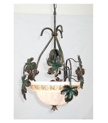 LAMPADARIO BACCO VERDE LAMPADE LAMPIONE LANTERNA APPLIQUE LAMPADARIO BACCO 1 luce Cruccolini Un'allegra collezione di lampade abilmente lavorate, ispirata alla tradizione italiana per il buon vino, tra le più apprezzate al mondo. Il lampadario "Bacco" è formato da una coppa di vetro travertino con un decoro floreale sul bordo, inserito fra rigogliosi tralci di vite in ferro battuto. Le foglie sono state minuziosamente cesellate dagli artigiani della Cruccolini, dettagli che attribuiscono ai nostri lampadari un valore superiore. Le lampade "Bacco" sapranno arricchire gli ambienti con brio ed eleganza. Da abbinare agli altri complementi della collezione.Dimensioni: à 32 x 50 â cm Paralume: Vetro travertino bianco con decoro floreale à cm 25 Massima estensione: 100 â cm Lunghezza catena: 50 â cmConsiglio d'uso: Lampadario ideale per l'illuminazione di cucine, saloni e patio. Ottimo anche per enoteche e wine bar. LC30 - Vetro travertino bianco con decoro floreale oro LC30B - Vetro ...