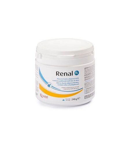 Renal N Renal N apporta fruttoligosaccaridi, polifenoli dell'olio di oliva, Enterococcus faecium e vitamine che favoriscono il mantenimento del normale metabolismo e di una idonea funzionalità intestinale. Ingredienti Maltodestrina 13.3.6, fruttoligosaccaridi 4.1.14, pirofosfato di sodio (Fosforo 23,3%, Sodio 17,3%) 11.3.13, lieviti e prodotti simili 12.1.5, farina di proteine di lupino 3.9.7 Olea europea L.: olive extract: 20000 mg Vitamine, provitamine Vitamina C 3a300: 50000 mg Vitamina B6 3a831: 5000 mg Acido folico 3a316: 2000 mg Vitamina B12: 100 mg Vitamina E/α-tocoferil acetato racemico 3a700 UI 8 Enterococcus faecium DSM 10663/NCIMB 10415 4b1707: 8690 mg Proteina grezza: 1,5% Fibra grezza: 0,5% Oli e grassi grezzi: 1,0% Ceneri grezze: 0,5% Umidità: 4,0% Calcio: 0,025% Fosforo: 0,004% Sodio: 0,030% Modalità d'uso Miscelare il prodotto alla consueta razione alimentare in ragione di 0,2 g di polvere per kg di peso corporeo al giorno, corrispondenti ai seguenti dosaggi giornalieri: • 1 misurino piccolo ogni 2,5 kg di peso; • 1 misurino grande ogni 10 kg di peso. È possibile suddividere la dose giornaliera in 2-3 somministrazioni, in base al numero dei pasti principali. Somministrare il prodotto a cicli di 30 giorni, attenendosi alle indicazioni fornite dal Medico Veterinario. È preferibile miscelare il prodotto al cibo umido. In caso di alimentazione esclusivamente secca, inumidire leggermente l'alimento per consentire una buona adesività della polvere e la sua completa assunzione. Si raccomanda di chiedere il parere di un veterinario prima dell'uso o prima di estendere il periodo di impiego. Si raccomanda acqua a volontà. Avvertenze Solo per uso veterinario: per animali non destinati alla produzione di alimenti. Tenere fuori dalla portata dei bambini e degli animali. Conservazione Conservare in luogo asciutto ed al riparo dalla luce. Chiudere accuratamente il barattolo dopo l'uso. Non destinato al consumo umano. Formato 240 g Cod. PA1873 ...