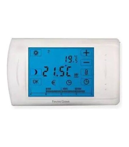 Il termostato elettronico a parete C804 FantiniCosmi a batteria ha il display retroilluminato. Questo comando regola la caldaia e impianti di riscaldamento e condizionamento. Funzione Temperatura a 4 livelli e programma Antigelo. La garanzia è ufficiale Italia Cronotermostato Settimanale Touch Screen Fantini Cosmi C804 Il termostato elettronico a parete C804 FantiniCosmi a batteria ha il display retroilluminato. Questo comando regola la caldaia e impianti di riscaldamento e condizionamento. Funzione Temperatura a 4 livelli e programma Antigelo. La garanzia è ufficiale Italia Caratteristiche elettriche Alimentazione 2 pile, 1.5Vdc LR6 AA. Portata dei contatti Max. 6(2)A 250 Vac 50 Hz. Uscita relay SPDT a potenziale libero. Installazione Montaggio a parete e su scatola 3 moduli. Collegamento all'utilizzatore con due fili. Nessuna modifica all'impianto esistente. Caratteristiche Grande display retroilluminato (blu), facile da programmare. Modalità di funzionamento riscaldamento e condizionamento. 4 livelli di temperatura: Comfort - Notturno - Economy - Antigelo (fisso a +7°C) Programmazione settimanale libera, settimanale a blocchi (5+2 o 7/7), a temperatura fissa. Funzione PARTY, VACANZA e OVERRIDE. Funzione BLOCCA SCHERMO. Temperatura ambiente e temperatura impostata SEMPRE VISIBILE. Funzione CronoSVEGLIA: è possibile impostare l'ora a cui si desidera essere svegliati tramite un allarme (bip). Cambio automatico ora solare/ora legale tramite calendario interno. Indicatore carica insufficiente batterie. Campo di regolazione da 5 ÷ 35°C. Passo di regolazione 0,5°C. Differenziale termico 0,2°C Programma antigelo 7°C. Accuratezza temperatura +/- 0,5°C a 20°C Intervallo temperatura di lettura +0°C/+40°C. Temperatura di funzionamento 0°C ÷ 40°C. Grado di protezione IP20. Dimensioni 13,7x8,0x2,5 cm. ...