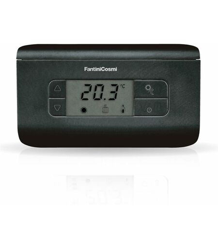 Termostato Fantini Cosmi CH117 Termostato a parete elettronico Fantini Cosmi CH117 a microprocessore, per il comando di impianti di riscaldamento e di condizionamento. Il modello CH115 (CH117) ha la possibilità di collegamento a una sonda secondaria per la temperatura di minima T/min e temperatura di massima T/max. Caratteristiche Marca: Fantini Cosmi Tipologia: Termostato a parete Modello unità: CH117 Codice catalogo unità: CH117 Colorazione: Antracite Tecnologia: Termostato ambiente a batterie, 3 temperature, a parete Connessione: Alimentazione 2 batterie AA 1,5V E’ possibile visualizzare il video dimostrativo cliccando qui. ...
