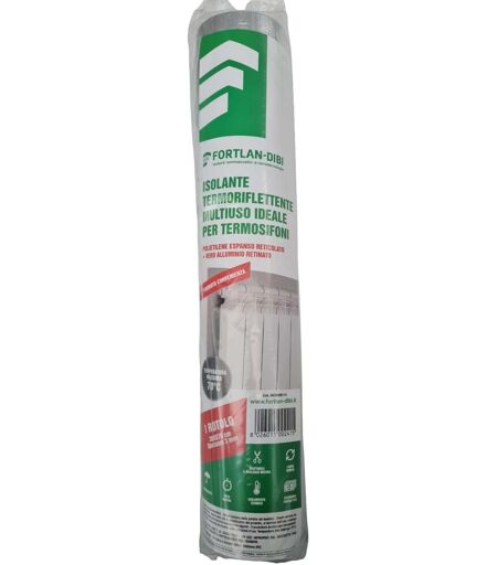 Il rotolo isolante termoriflettente di Fortilan-Dibi è ideale come isolante per i termosifoni. Prodotto da Polietilene spanso reticolato con vero Alluminio retinato. Il rotolo è adattabile a qualsiasi misura di termosifone, con la sua posa rapida, comporta già da subito un risparmio energetico. Può essere utilizzato per altri utilizzi come l'isolamento di stufe e camini. Misure: 300x70 cm Spessore: 3 mm ...