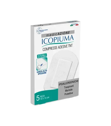 Compresse Adesive TNT 10x15cm 5 Pezzi - DESCRIZIONE PRODOTTO: - Le Compresse Adesive TNT 10x15cm di Icopiuma offrono una soluzione pratica per la cura delle ferite. Realizzate in tessuto non tessuto (TNT), queste compresse sono composte da un supporto adesivo 100% poliestere che garantisce un'adesi… ...