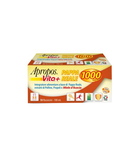 Apropos Vita+ Pappa Reale 1.000 mg - Descrizione Integratore alimentare a base di pappa reale, estratti di polline, propoli e miele d'acacia. Apropos Vita+ Pappa Reale 1.000 mg è un integratore alimentare con un'altissima concentrazione di pappa reale fresca, nota sostanza prodotta dalle api come n… ...