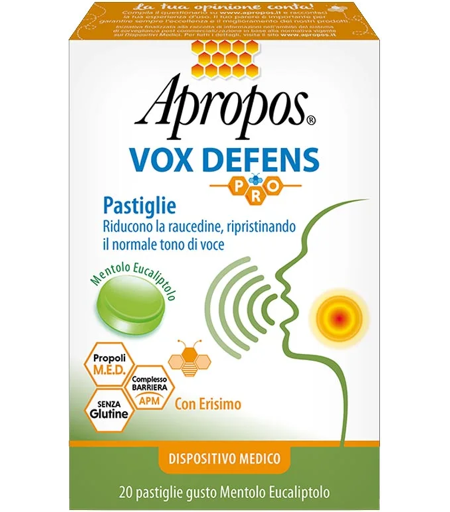 Dispositivo Medico per Raucedine e Gola Irritata - DESCRIZIONE PRODOTTO: - Apropos Vox Defens Pro Mentolo Eucaliptolo è un dispositivo medico in pastiglie indicato per favorire il benessere delle corde vocali e alleviare i fastidi legati a raucedine, voce affaticata o alterata. Grazie alla sua azio… ...