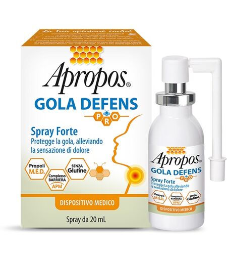 Apropos GOLA DEFENS PRO - Spray No Alcol - Descrizione Dispositivo Medico CE Classe IIa (Dir. 93/42/CEE). Non sterile. Apropos Gola Defens PRO, grazie al Complesso Barriera APM composto da “Attivi Polimerici Mucoadesivi”, crea un film mucoadesivo ad effetto barriera che protegge la mucosa orofaring… ...