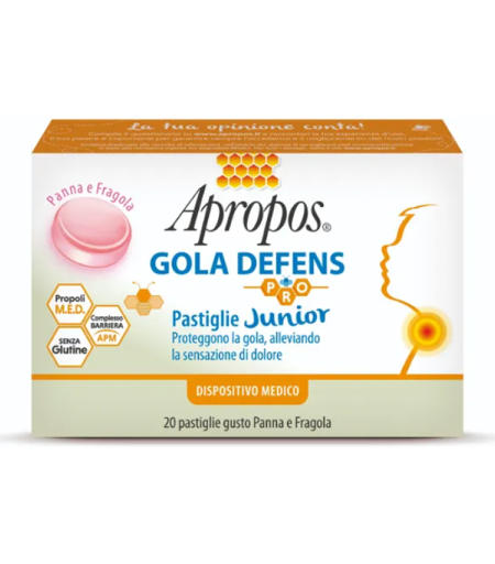 Apropos Gola Defence Pro Junior 20 Pastiglie Panna e Fragola - DESCRIZIONE PRODOTTO: - Le pastiglie Apropos Gola Defence Pro Junior al gusto panna e fragola sono state appositamente formulate per proteggere la gola dei bambini e alleviare la sensazione di dolore. Questo dispositivo medico senza glu… ...