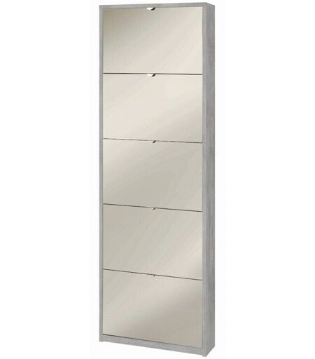 Scarpiera in kit con struttura colore cemento e ante con specchio. Dotata di 5 ante a ribalta singola, capacità fino a 12 paia di scarpe. Maniglie in alluminio satinato. Design moderno e luminoso per ingressi contemporanei. Tipologia: scarpiera 5 ante a ribalta con specchio in kit Struttura: colore cemento Ante: specchio Dimensioni: 63×18×190 cm Materiale: pannello truciolare nobilitato Spessori: 18 mm struttura, 16 mm ante Capacità: 12 paia di scarpe Maniglie: alluminio satinato Bordi: ABS Montaggio: da assemblare ...