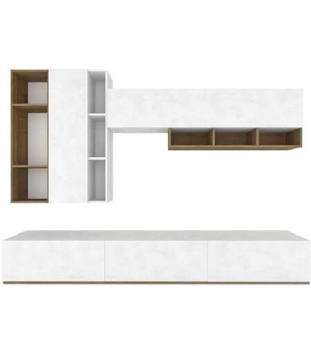 Questa elegante parete attrezzata per soggiorno misura 267x194h cm ed è caratterizzata da una raffinata combinazione di finiture in Noce Stelvio e Ossido Bianco. La struttura, già montata, presenta uno spessore di 18 mm con pianali da 25 mm e bordi in ABS di alta qualità. Il mobile TV include una varietà di soluzioni di storage: vani chiusi con apertura push-pull, pensili verticali e orizzontali con pistoni per ante a ribalta, e cassettoni dotati di guide in metallo ad estrazione totale. I vani a giorno offrono spazio espositivo, mentre i compartimenti chiusi assicurano un'organizzazione ordinata. Le venature del legno Noce Stelvio riproducono fedelmente l'aspetto naturale, mentre il bianco aggiunge luminosità all'ambiente. La disposizione modulare combina basi a terra e sospese, creando una composizione contemporanea che si adatta perfettamente a qualsiasi soggiorno moderno. DIMENSIONI: Mobile TV componibile di 267 cm di larghezza e 194 cm di altezza, perfetto per arredare il ...